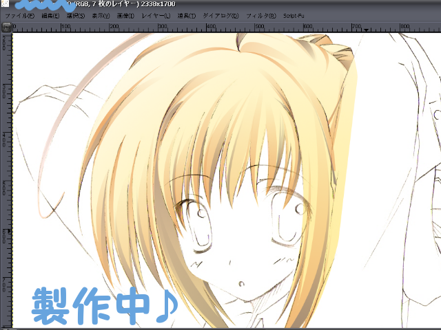 今回はもう途中画像のUPは無しですw もう結構出来てきたから見せると完成したときにつまらなくなる(笑 まぁ、予想より時間かかりまくってはいるものの、今日一日としてみれば作業してた時間が長いのでそこそこに進みはしました^^ 時間に比例して進まなかったのは残念orz なんで苦戦したのかと言うと。。。 きんぱつに引き続き「碧眼」にも苦戦したのと、もう一人のキャラが「右向き」だからですね^^; いつになっても右向きは苦手です(T T) 線画までは左向きを裏向きトレースすれば何とか描けるんだけど。。。 まぁ、完成時期の予想としては・・・ 早ければ明日かな?うまく行けば日付が変わって少ししたらUPできると思われます^^ 明日終わらなかった場合は、。。。10日までずれ込む可能性が^^; 金曜はバスケのクラブチームの練習があるのであまり進められないので;; まぁ、できるだけ明日で終わらせますさ♪ ただ今、コードギアスのサントラ聴きながら次回作絶賛制作中w この絵は2人描いているので、そのうちの一人ですな^^ ・・・進み遅っ!!orz しかも、この状態じゃ誰なのかあんまわからんな;;;www まぁ、がらくたおきばを見た人は知ってるんだけどw いやぁ、過去にも一度この人は描いてるんだけど・・・髪ムズイなぁ^^;; 黒系統、茶色系統、グレー系統、ピンク系統とかはダイブぱっぱと塗れるようになったんだけど・・・きんぱつって背景の色に合わせて微妙に変えていかなきゃ変になる気がするから気を使う^^;;ww 今日はもう一人の人の髪を塗り終えるまで行きたいなぁ。。。と思います^^ ・・・火曜はバスケの練習があるからそれまでに進めたい・・・!w